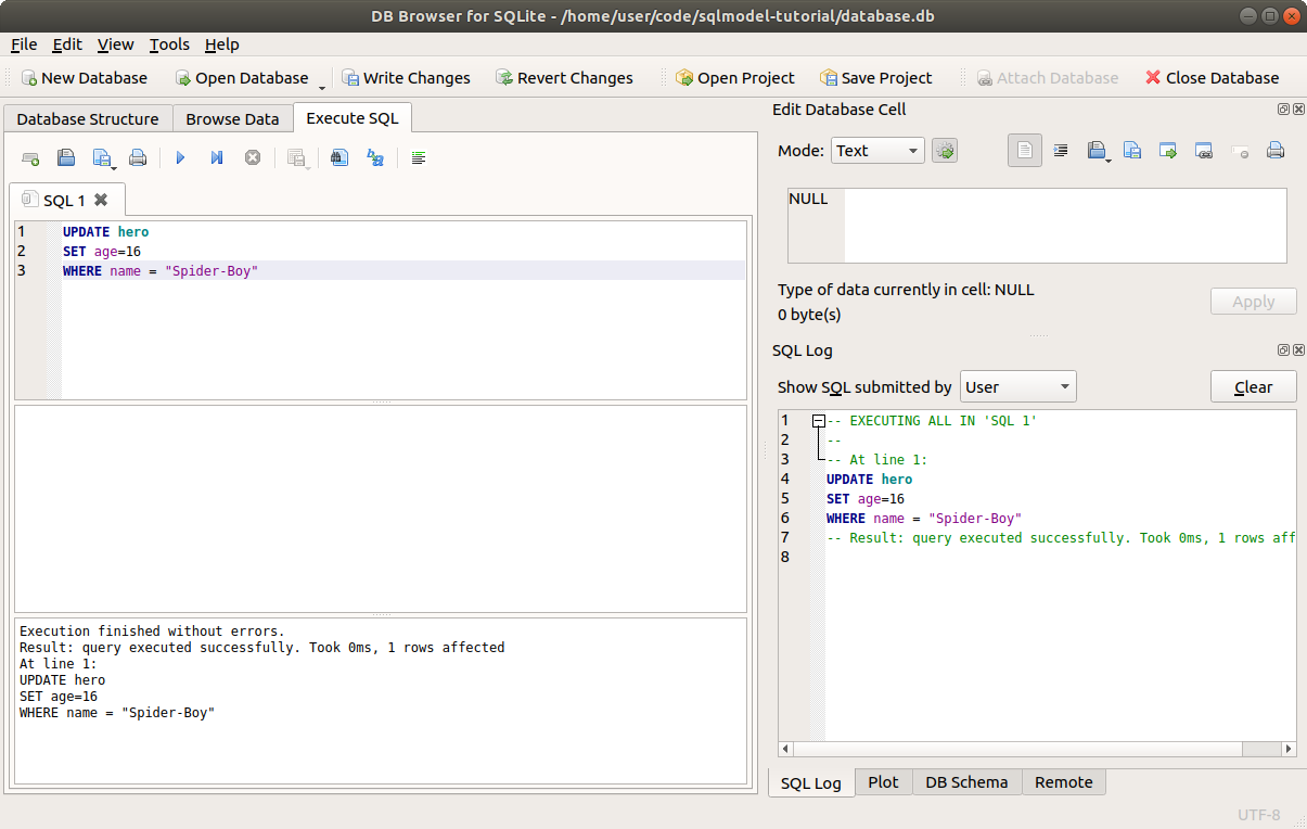 INFO Engine UPDATE hero SET name=?, age=? WHERE hero.id = ? INFO Engine [generated in 0.00028s] (('Spider-Youngster', 16, 2), ('Captain North America Except Canada', 110, 7)) INFO Engine COMMIT